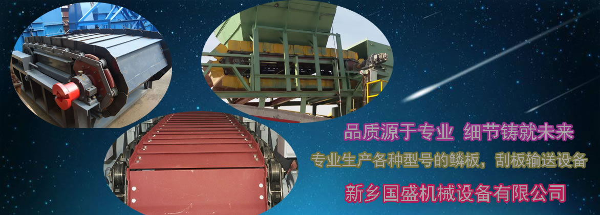 板式給料機(jī)在工作時(shí)傳動(dòng)裝置的電動(dòng)機(jī)經(jīng)過(guò)減速機(jī)、聯(lián)軸器的帶動(dòng),使主驅(qū)動(dòng)軸旋轉(zhuǎn),重疊的輸送機(jī)鱗板固定在兩邊的鏈條上,兩個(gè)主動(dòng)鏈輪帶動(dòng)兩邊鏈條,鱗板上的托輪通過(guò)機(jī)架上的導(dǎo)軌導(dǎo)向,通過(guò)鏈條的傳動(dòng)將鱗板上的物料輸送到卸料處。