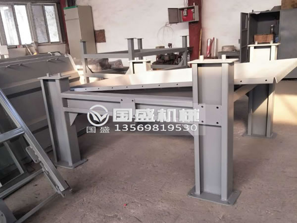 篩板材質(zhì)為304條縫篩板,篩孔為5mm,采用條縫橫向布局,2臺(tái)振動(dòng)電機(jī)型號(hào)為YZS-20-6,電機(jī)功率為1.5kw,篩機(jī)安裝傾角為5°,由于污泥需要進(jìn)行清洗,因此脫水篩上方建議安裝沖洗管道,篩機(jī)主體和積水槽之間的材質(zhì)采用帆布軟連接,沖洗管道及布料器和篩機(jī)無硬連接,支撐架的作用是為了支撐沖洗管管路及布料器,上蓋和篩機(jī)采用快開箱口。